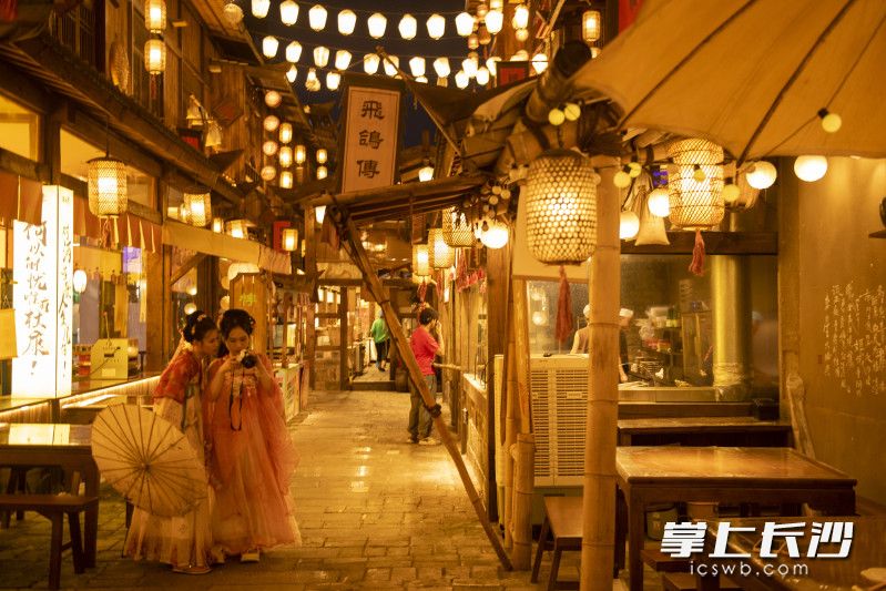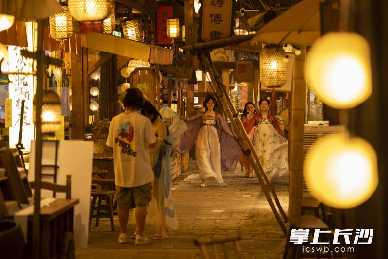 The photos taken on the evening of August 27 show many tourists dressed in Hanfu taking photos in the Han culture themed block of Furong District, Changsha City.