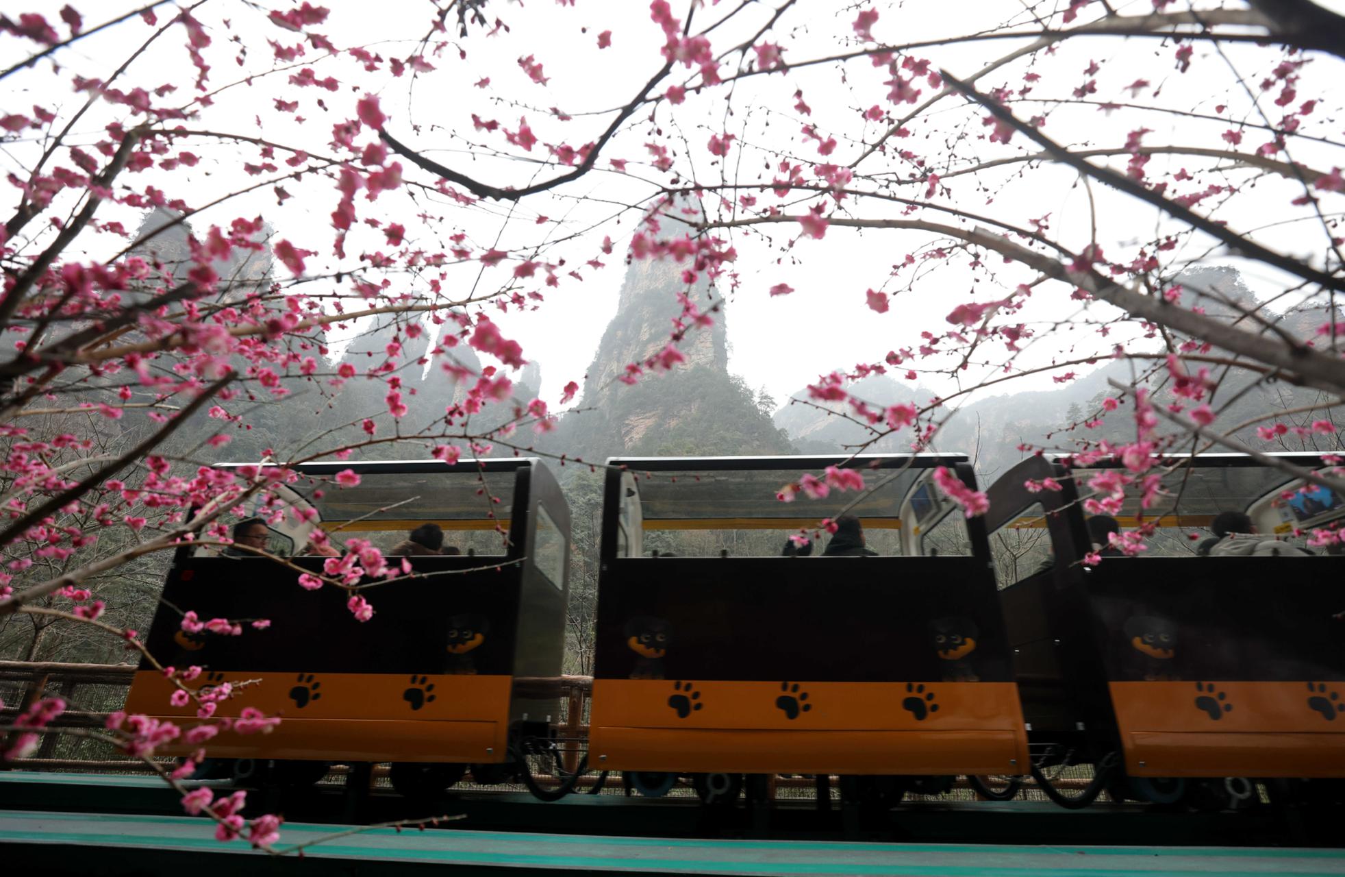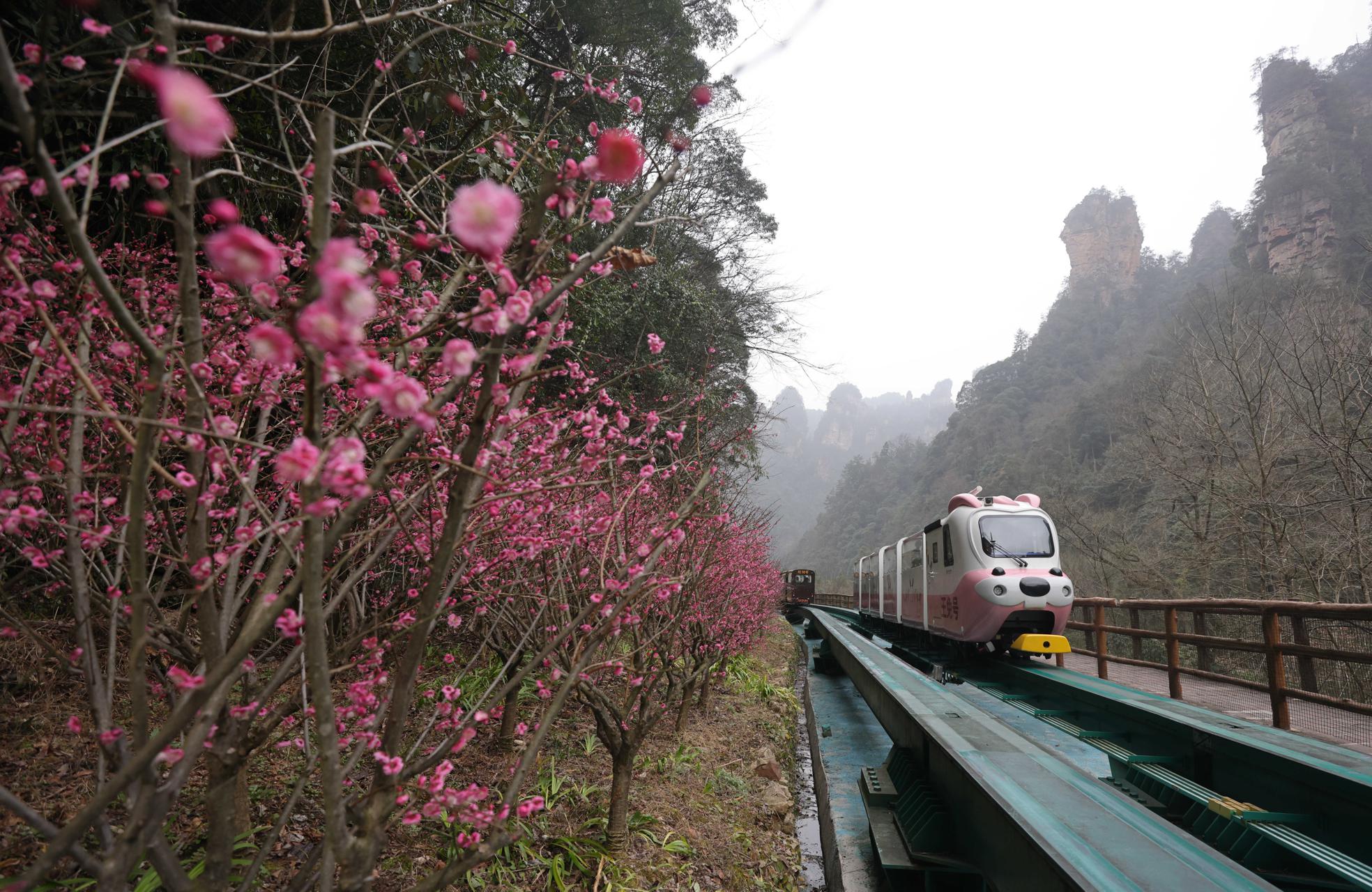 The photos taken on February 19 show tourists taking the sightseeing train to enjoy plum blossoms in the Ten-mile Gallery Scenic Spot of Zhangjiajie National Forest Park.
