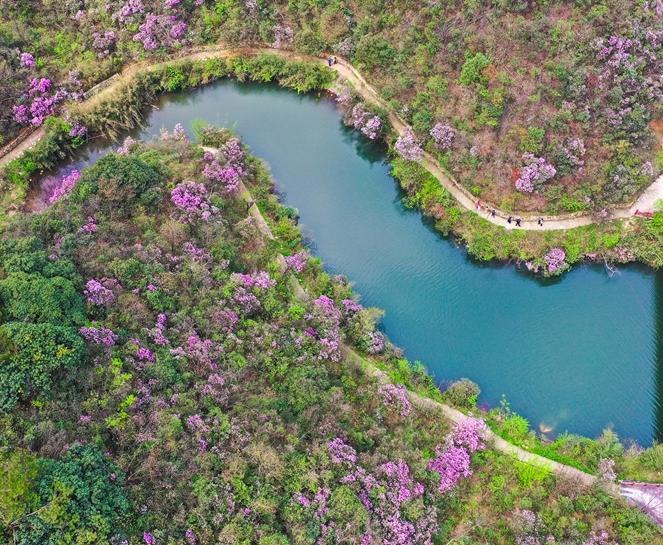 Photos taken on April 14 show mountain flowers blooming in Wanhe Lake Scenic Spot of Yangming Mountain National Forest Park.