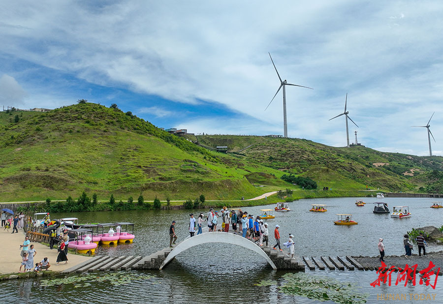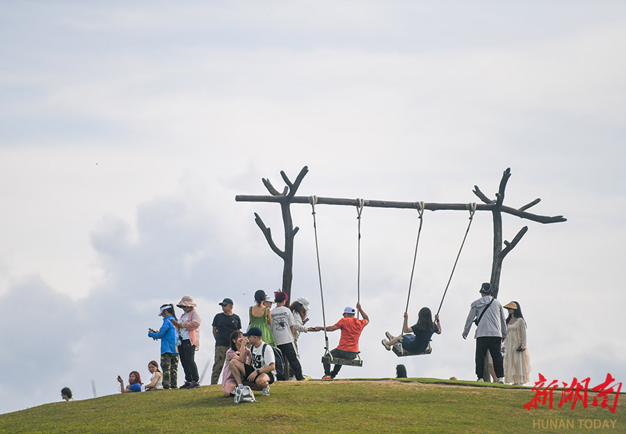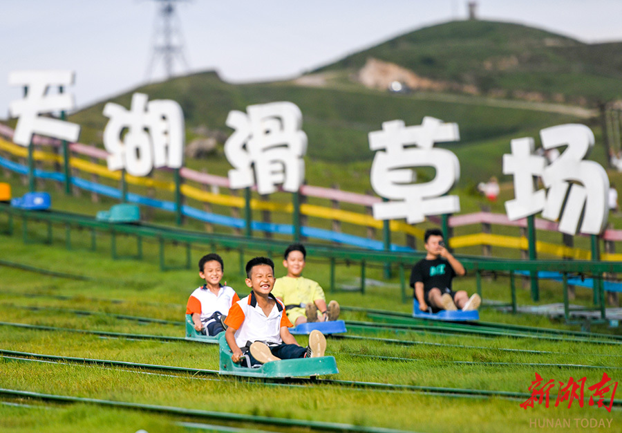 The photos taken on July 13 show tourists enjoying grass-skiing at the Yangtian Lake Grassland in Beihu District, Chenzhou City.