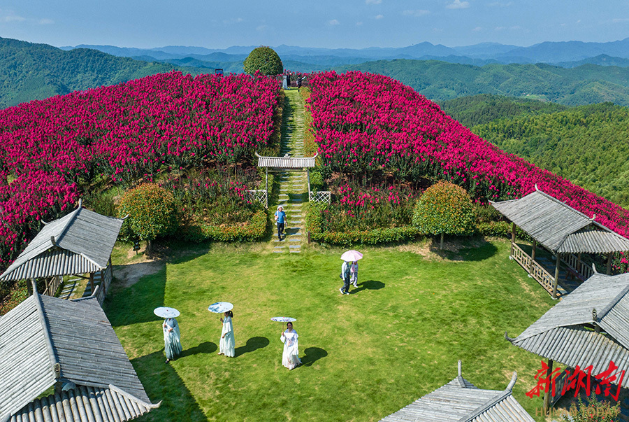 The photos taken on July 21 show tourists appreciating crape myrtle flowers at Shuiyuan Mountain of Banqiao Village, Hongjiang City, Huaihua City. In recent years, the village has worked to develop tourism plus other industries. It has transferred over 700 mu (about 46.67 hectares) of land to plant ornamental flowers and plants like lilies, roses, cherry blossoms and plum blossoms, driving the development of the local tourism industry.