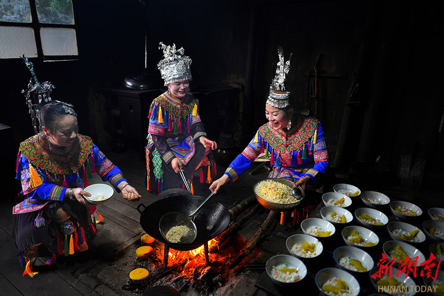 The photo taken on February 21 shows Dong women making oil tea in Xianghui Village, Tongdao Dong Autonomous County, Huaihua City. That day, guests of the surrounding villages came to Xianghui Village to express New Year’s greetings, and villagers treated their guests with fragrant oil tea. Oil tea is a special food of Dong nationality, and it’s also a delicacy for guests of Dong people.