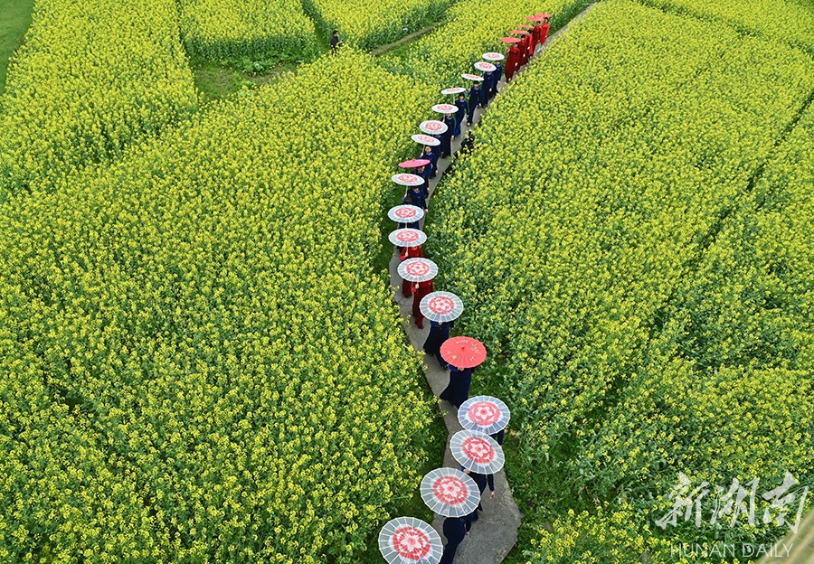 The photo taken on March 19 shows women staging a cheongsam show at the oilseed rape base in Jinjing Village, Longhui County, Shaoyang City. Recently, the cole flowers in the village have been in full bloom, attracting many tourists and boosting rural tourism.