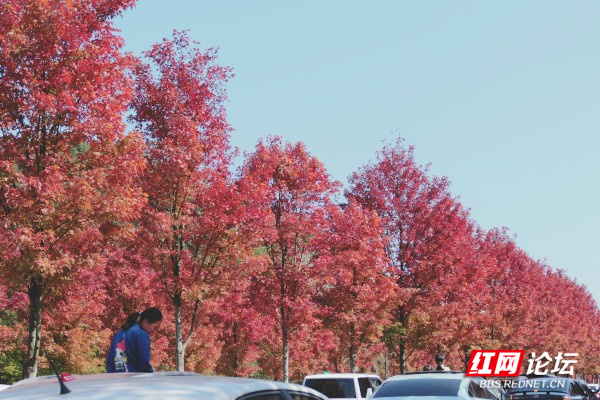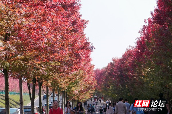 Hongfeng Avenue has 10 two-way lanes with a total length of 6.8 kilometers. There are thousands of red maple trees planted in the three green belts. The top and the outer leaves are eye-catching red, and the leaves under the branches are still green or yellow. The maple trees are currently in the best viewing period.