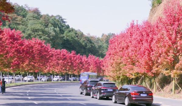 The photos taken on October 22 show rows of red maple trees swaying in the wind in the clean and wide Hongfeng Avenue, Heshan District, Yiyang City.