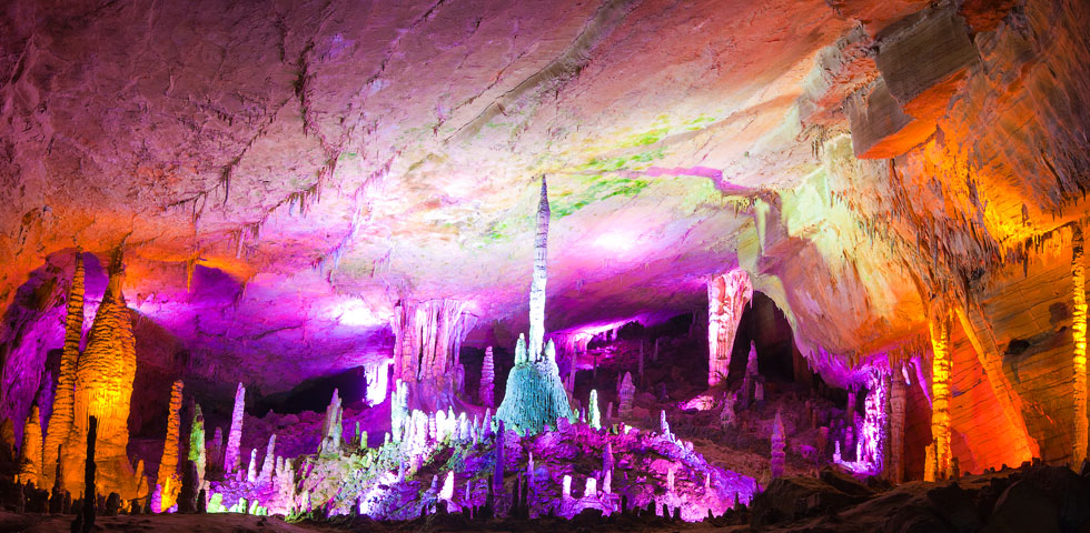黃龍洞以其高闊的洞天、幽深的暗河、密集的石筍而出名。洞中眾多的石乳、石柱等各種鐘乳石,在燈光的照耀下,多姿多彩。特別是標(biāo)志性景點(diǎn)“定海神針”,高達(dá)20米的鐘乳石柱,最細(xì)處直徑只有10厘米。