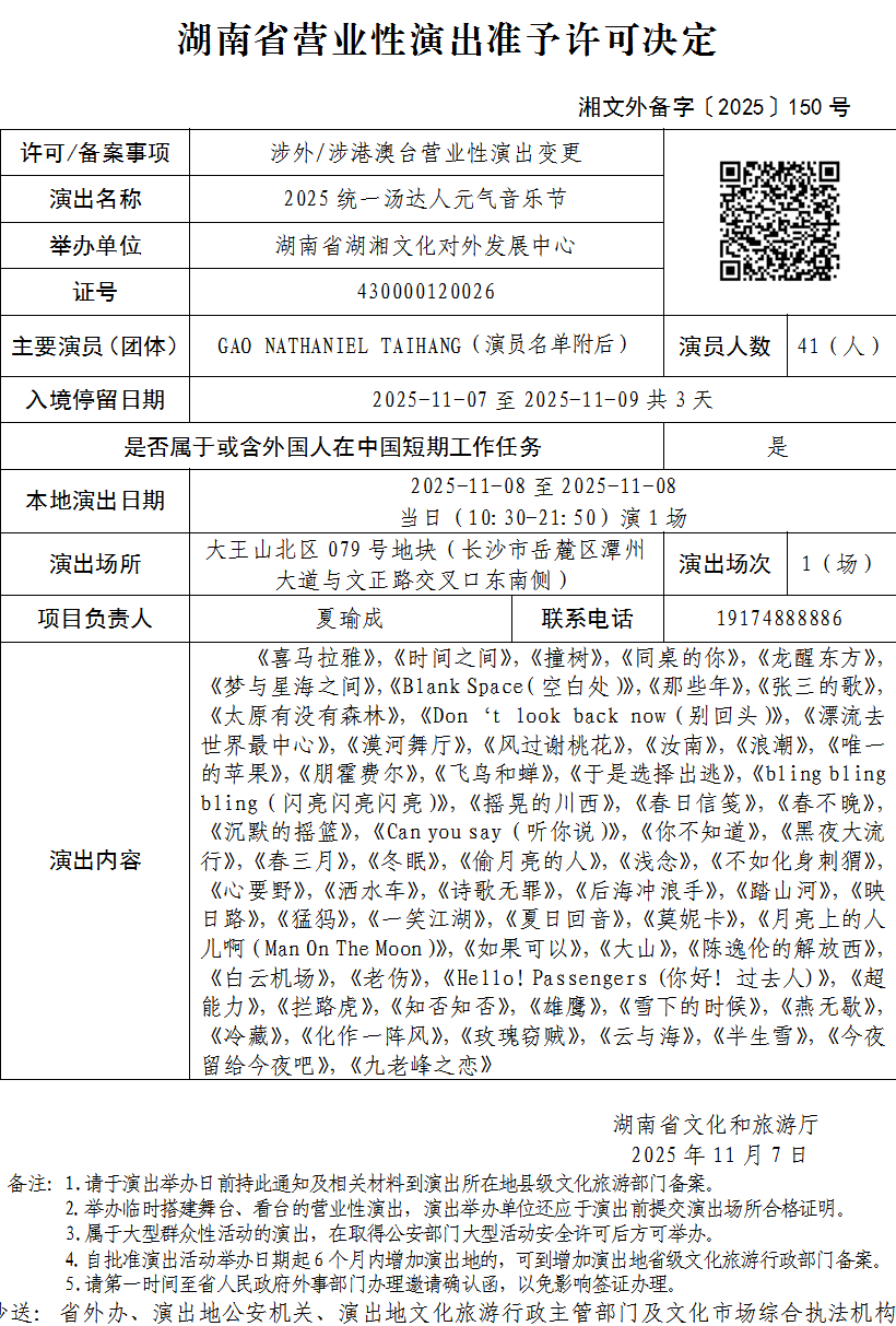 湖南省營業性演出準予許可決定-湘文外備字〔2025〕150號