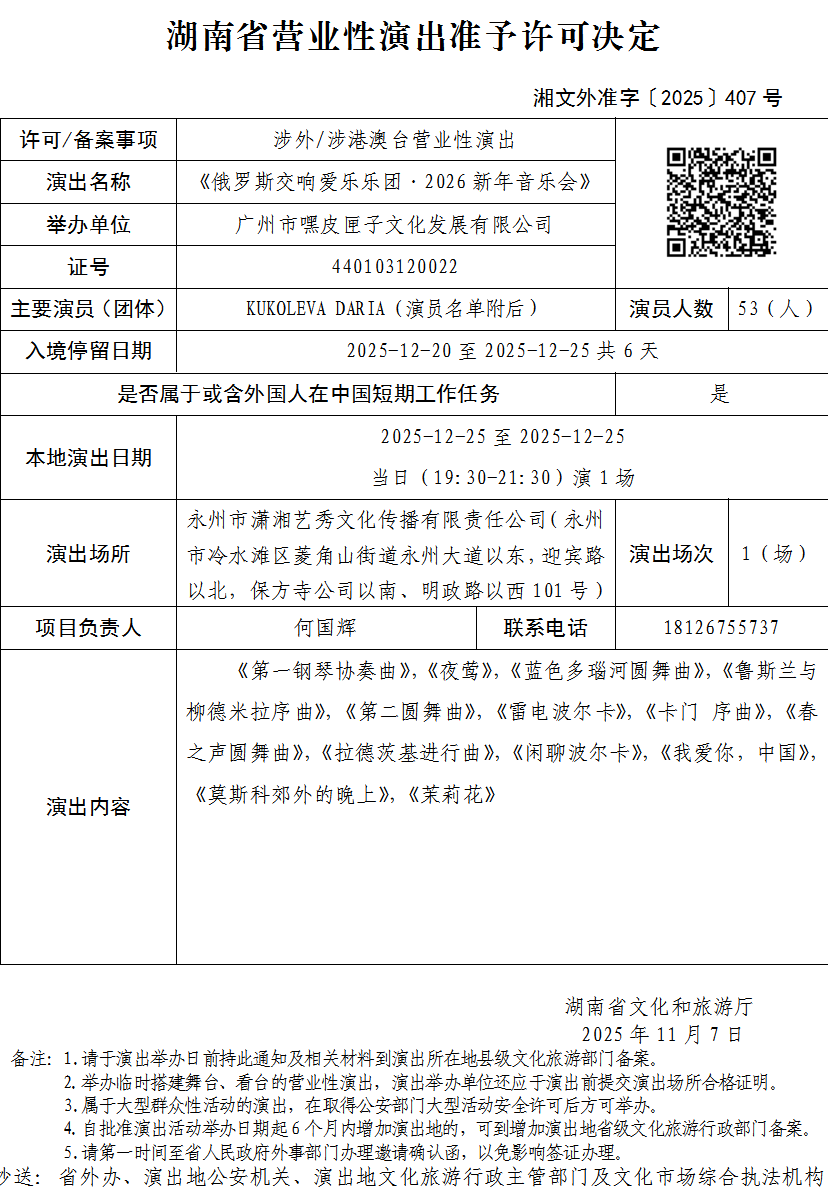 湖南省營業性演出準予許可決定-湘文外準字〔2025〕407號