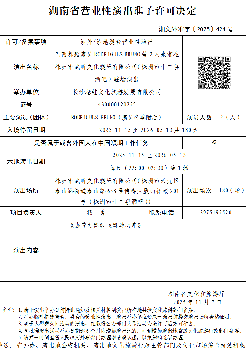 湖南省營業(yè)性演出準(zhǔn)予許可決定-湘文外準(zhǔn)字〔2025〕424號